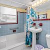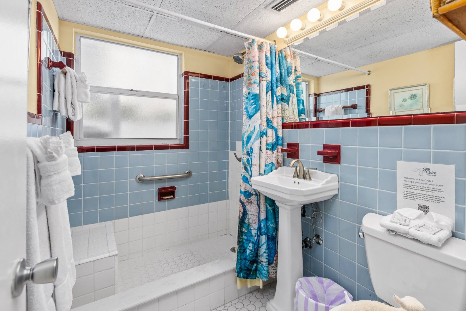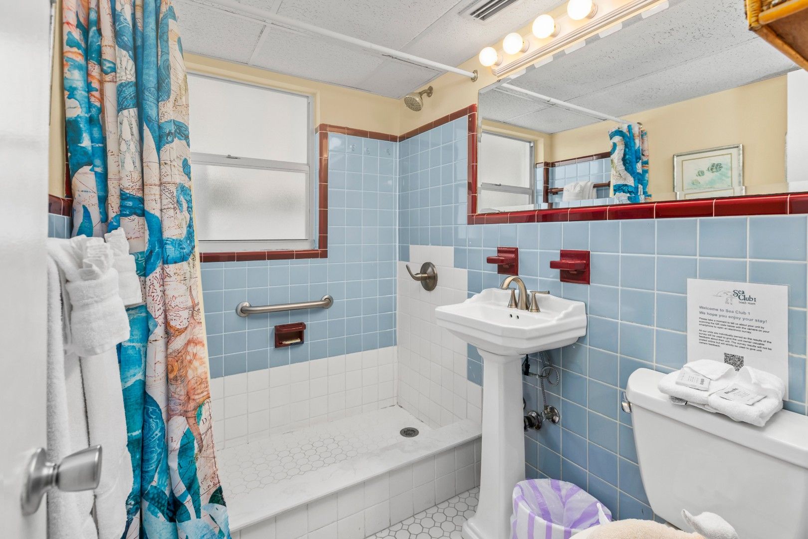 - Bathroom Shower/Tub Combo, towels for bathing and hairdryer. Tile and Terazzo flooring.