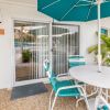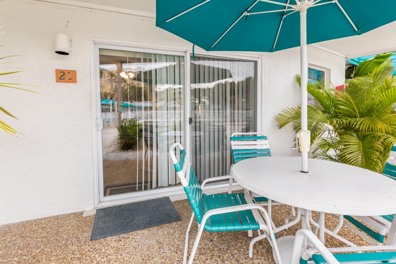 - Front patio with pool & gulf view, table, umbrella & chairs, Rear patio with chairs