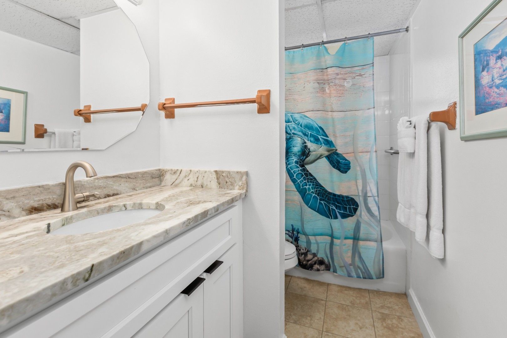 - Bathroom Shower/Tub Combo, towels for bathing and hairdryer. Tile Flooring throughout.