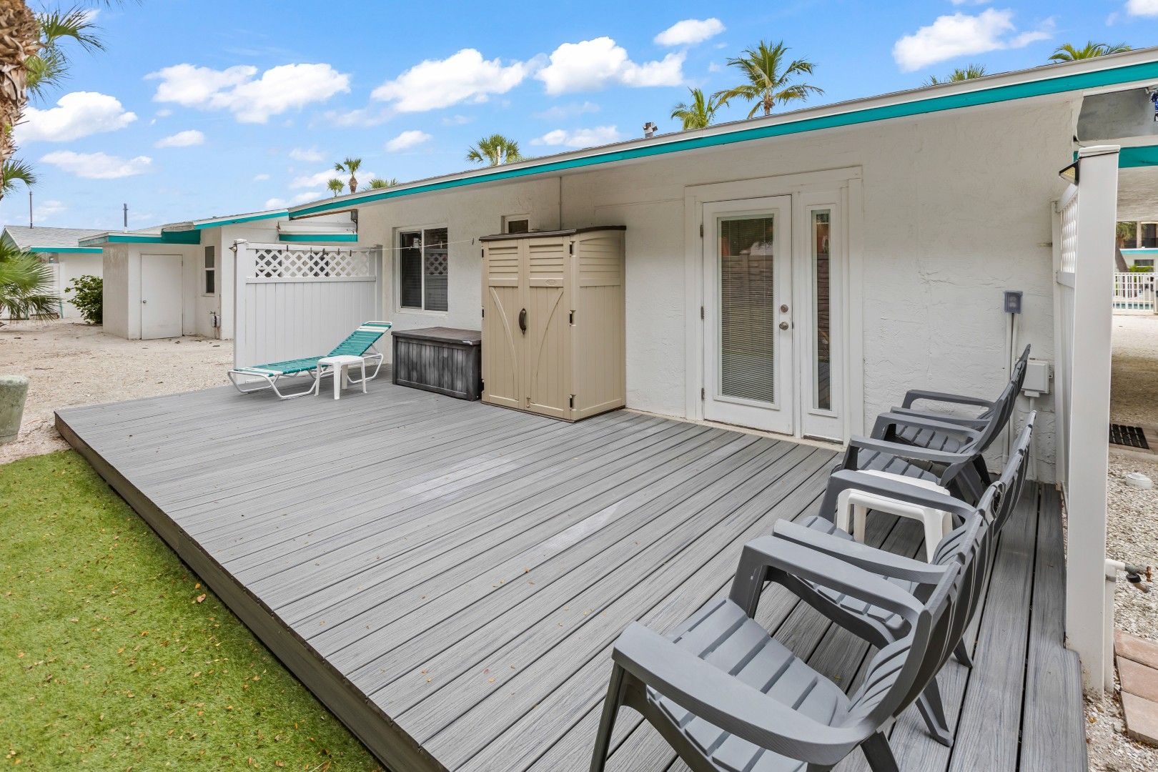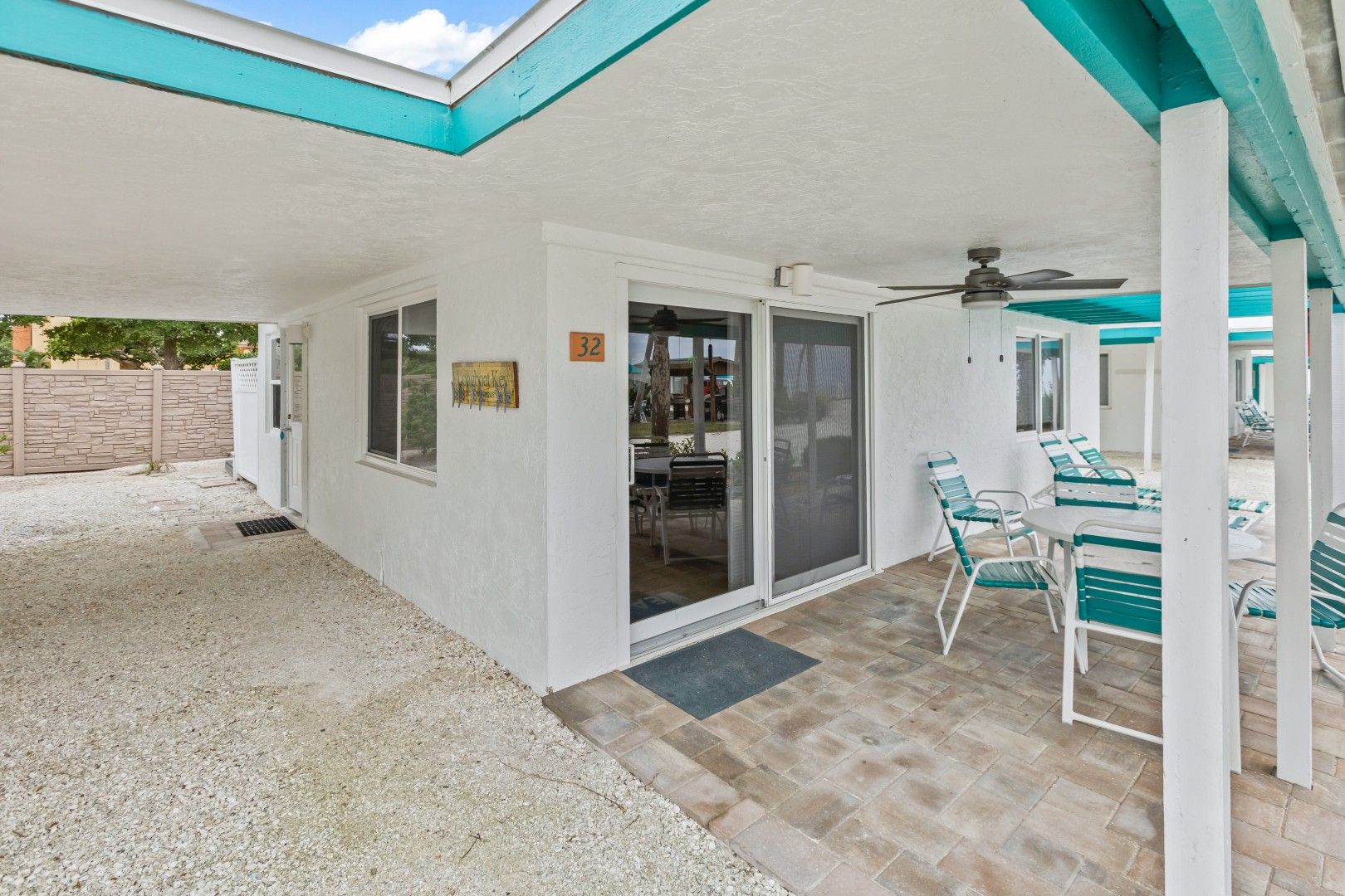 - Front covered patio with pool & gulf view, table and chairs, Rear Patio with chairs