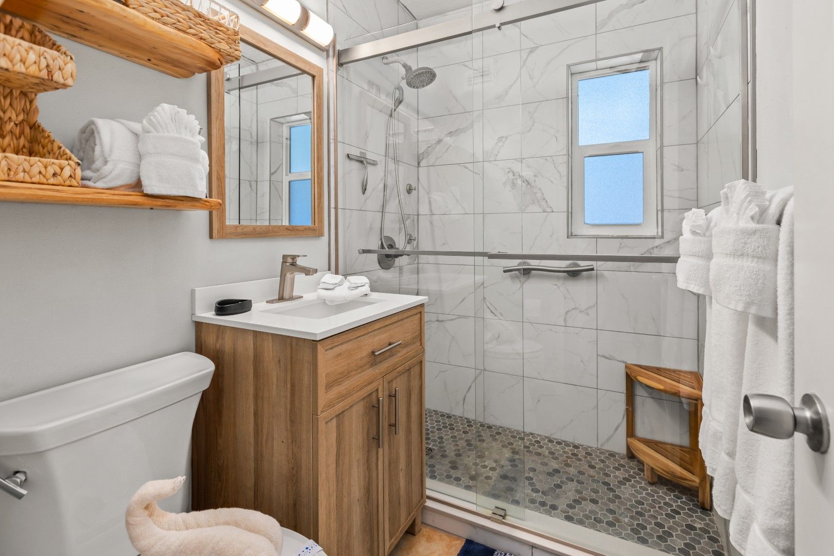 - Walk In – Shower, towels for bathing and hairdryer. Hard Wood and Tile Flooring.