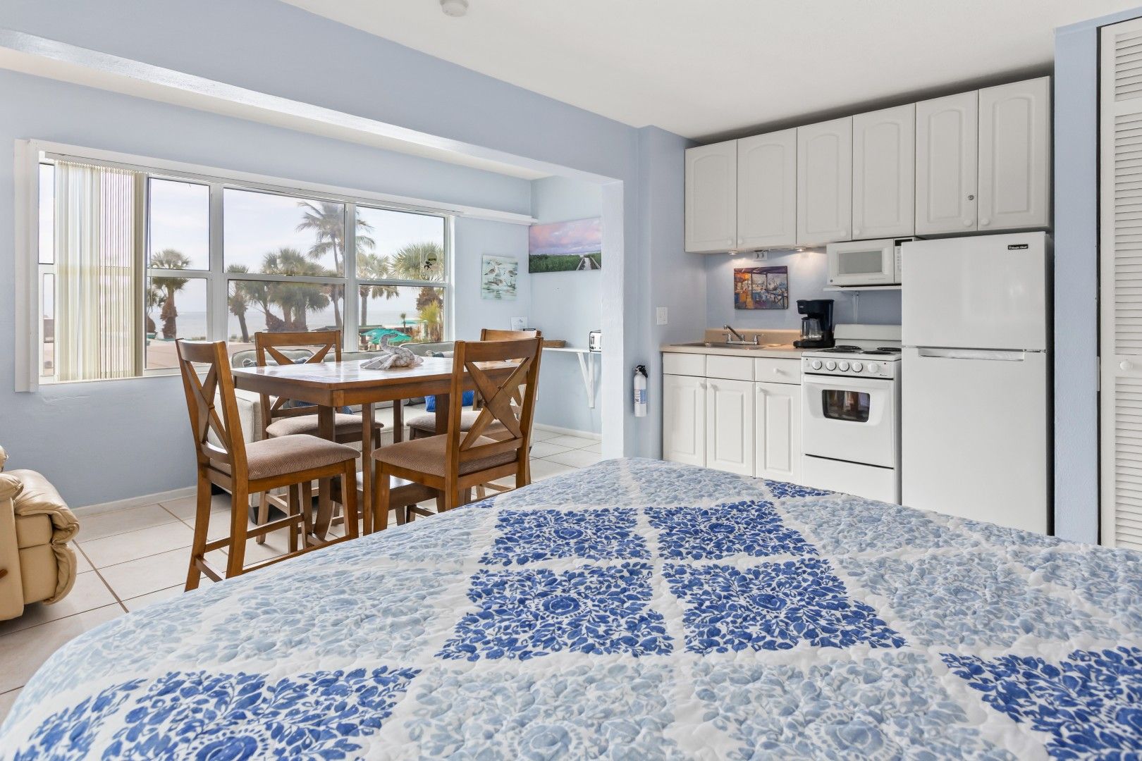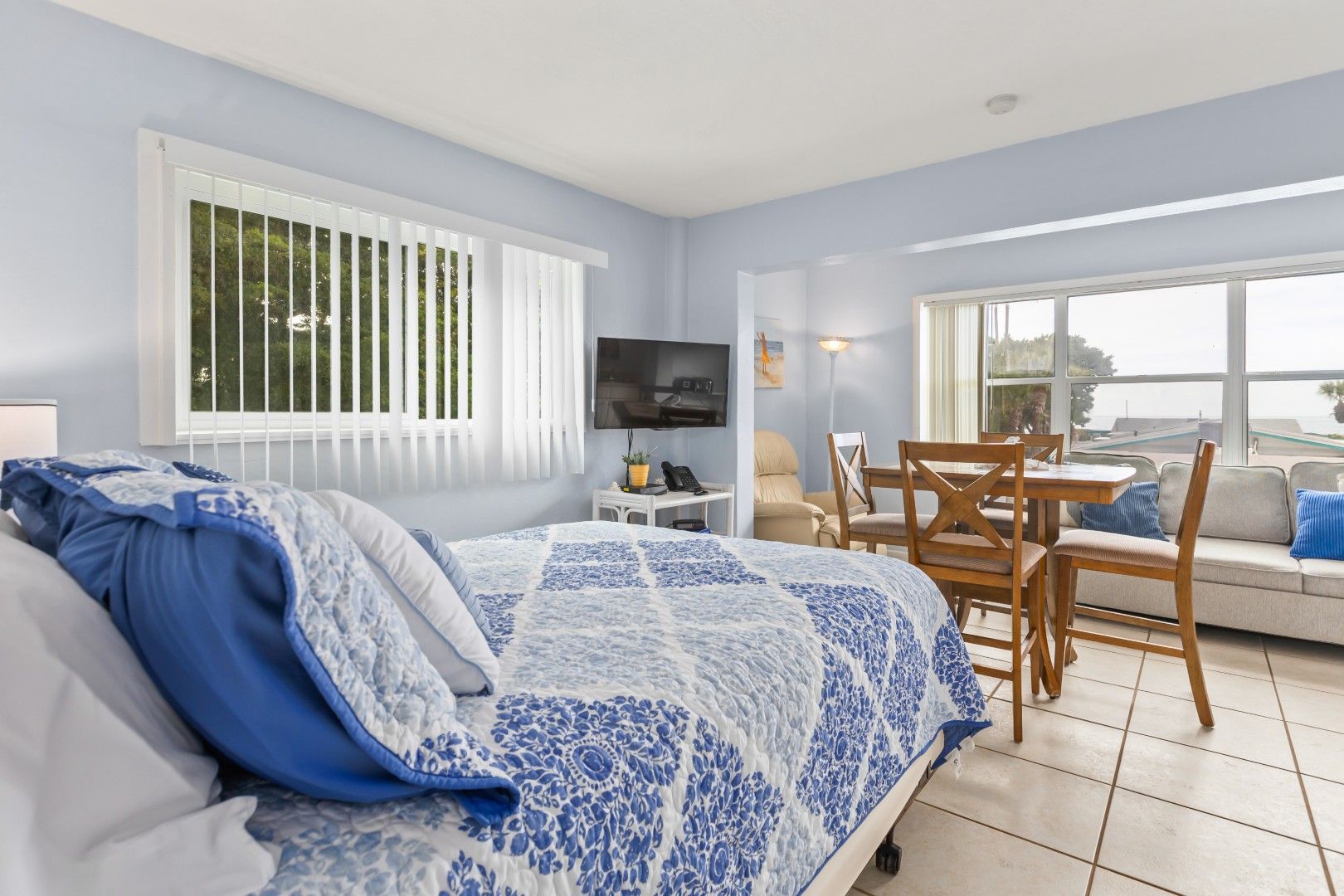 Ceramic tile throughout; Large windows with partial view of the Gulf